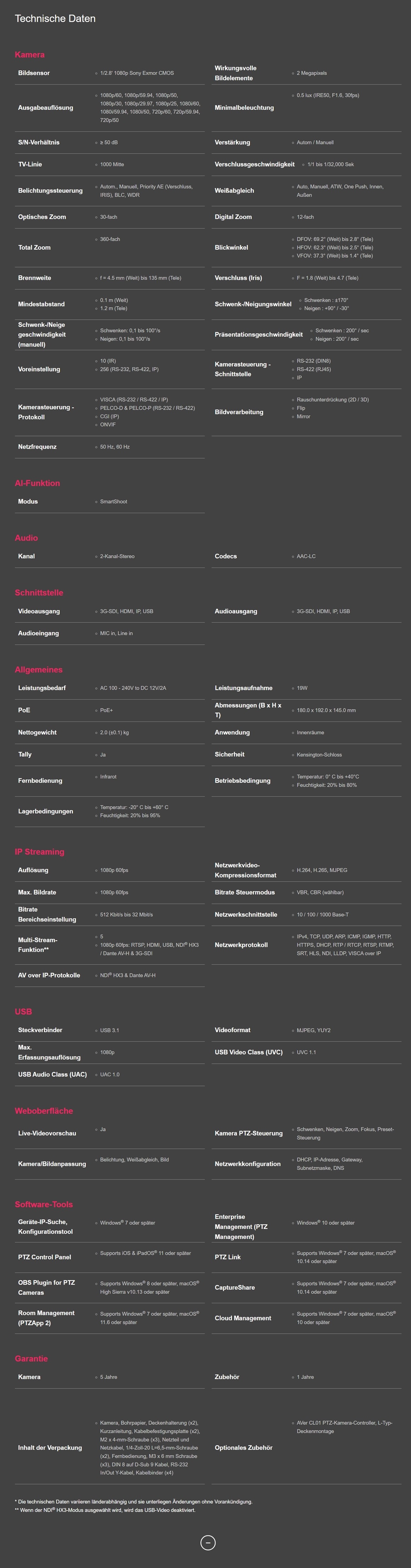 AVers PTZ231 ist eine fortschrittliche PTZ-Kamera mit vollständiger Kontrolle über Ihren Streaming-Inhalt. Professionelle Streamen mit Full-HD 1080p-Ausgängen bei 60ftps, mit 30-fach optischem Zoom und hochmodernem SmartShoot-Feature. Dank der optimalen Livestream-Performance werden Sie Ihr Publikum mit der PTZ231 garantiert verblüffen.