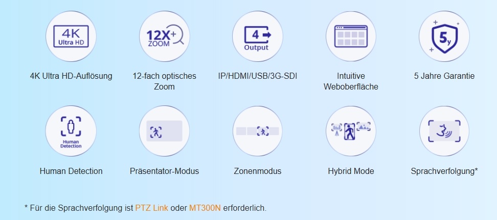 AVers neue TR315 KI Auto Tracking PTZ-Kamera erweitert die leistungsstarken und zuverlässigen Pro AV-Fähigkeiten für Anwender in der gesamten Industrie. Die TR315 beeindruckt mit proprietären Funktionen — einschließlich Tracking im Presenter-Modus, Zonenmodus und Hybridmodus — gestützt auf fortschrittliche KI-Verarbeitung. Die nahtlose Zusammenführung von 12-fach optischer Zoomlinse, 4K 60 fps Auflösung, Feinheit von Hybrid-Auto-Tracking und reibungslosen PTZ-Abläufen ist schon heute die erste Wahl für Senden, Streamen und Aufzeichnen.