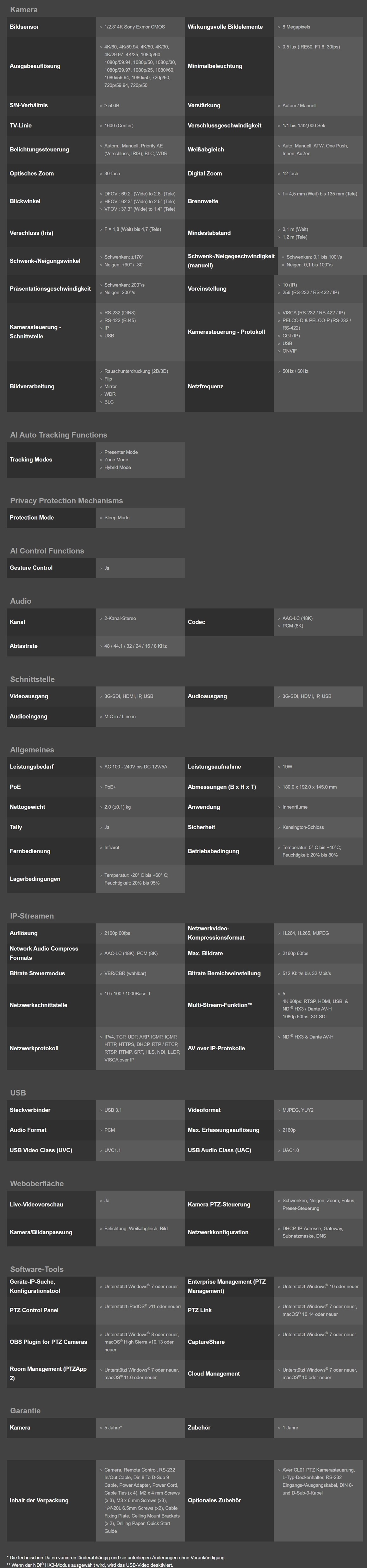 AVers neue TR335 KI Auto Tracking PTZ-Kamera erweitert die leistungsstarken und zuverlässigen Pro AV-Fähigkeiten für Anwender in der gesamten Industrie. Die TR335 beeindruckt mit proprietären Funktionen — einschließlich Tracking im Presenter-Modus, Zonenmodus und Hybridmodus — gestützt auf fortschrittliche KI-Verarbeitung. Die nahtlose Zusammenführung von 30-fach optischer Zoomlinse, 4K 60 fps Auflösung, Feinheit von Hybrid-Auto-Tracking und reibungslosen PTZ-Abläufen ist schon heute die erste Wahl für Senden, Streamen und Aufzeichnen.