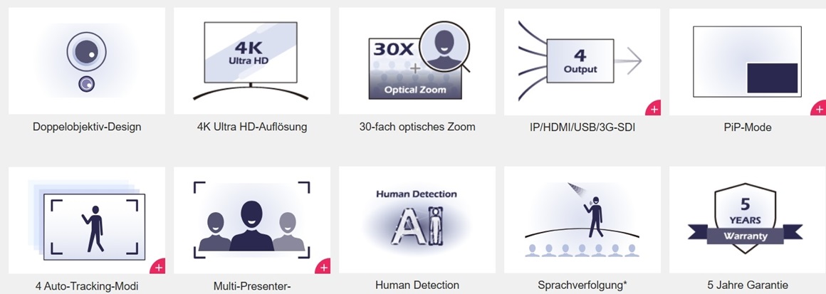 Die Zukunft der Streaming-Exzellenz mit AVER TR535, mit KI Auto-Tracking für unzählige Anwendungen. PTZ-Kamera TR535 mit 30-fach Stellar-Zoom und weitreichendem Weitwinkel. Das Weitwinkelobjektiv erfasst die gesamte Szene, die 4K PTZ-Kamera zoomt für Nahaufnahmen hoch und gewährleistet die vollständige Erfassung. Mit vier fortschrittlichen KI-gesteuerten Trackingmodi liefert die TR535 einzigartige Präzision beim Senden, Streamen und Aufzeichnen.