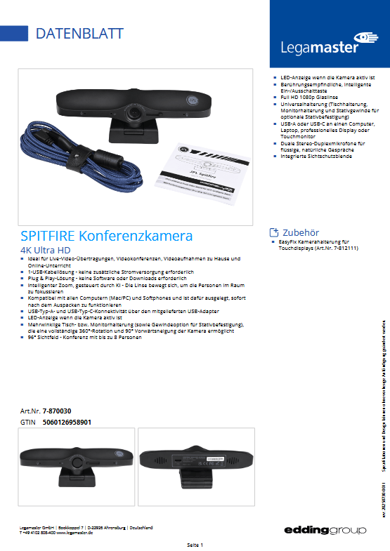 Die JPL Spitfire ist eine 4K Ultra HD Kamera, die für kleine bis mittelgroße Konferenzräume entwickelt wurde. Sie verfügt über einen intelligenten Zoom, zwei Stereo-Duplex-Mikrofone mit einer Reichweite von 5 Metern. Die Plug-and-Play-Connection gewährleistet eine nahtlose Integration mit Unsere Geräten und macht sie zur idealen Wahl für die Verbesserung von Remote-Meetings.