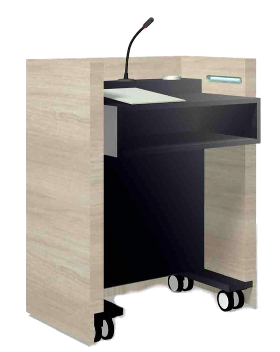 Im Inneren bietet es in der Grundversion eine schräge Dokumentenfläche, eine Ablage für ein Notebook, Beleuchtung, Wasserglasring, eine digitale Redezeituhr und ein Anschlußfeld für Medientechnik.