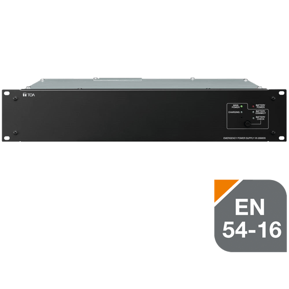 Die Notstromversorgungseinheit VX-2000DS versorgt jedes Gerät im VX-2000-System mit Gleichstrom über den Anschluss des Netzteils VX-200PS. Sie hält die Batterieeinheit, die 2 #83 12 V versiegelte Bleibatterien enthält, geladen und kompensiert so die Temperatur der Batterieladespannung. Wenn die Gleichstromversorgung des VX-200PS stoppt, wird VX-2000DS automatisch auf die Backup-Batterie umgeschaltet.